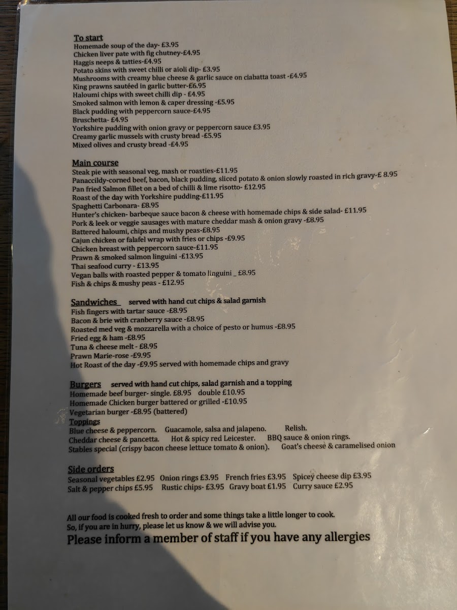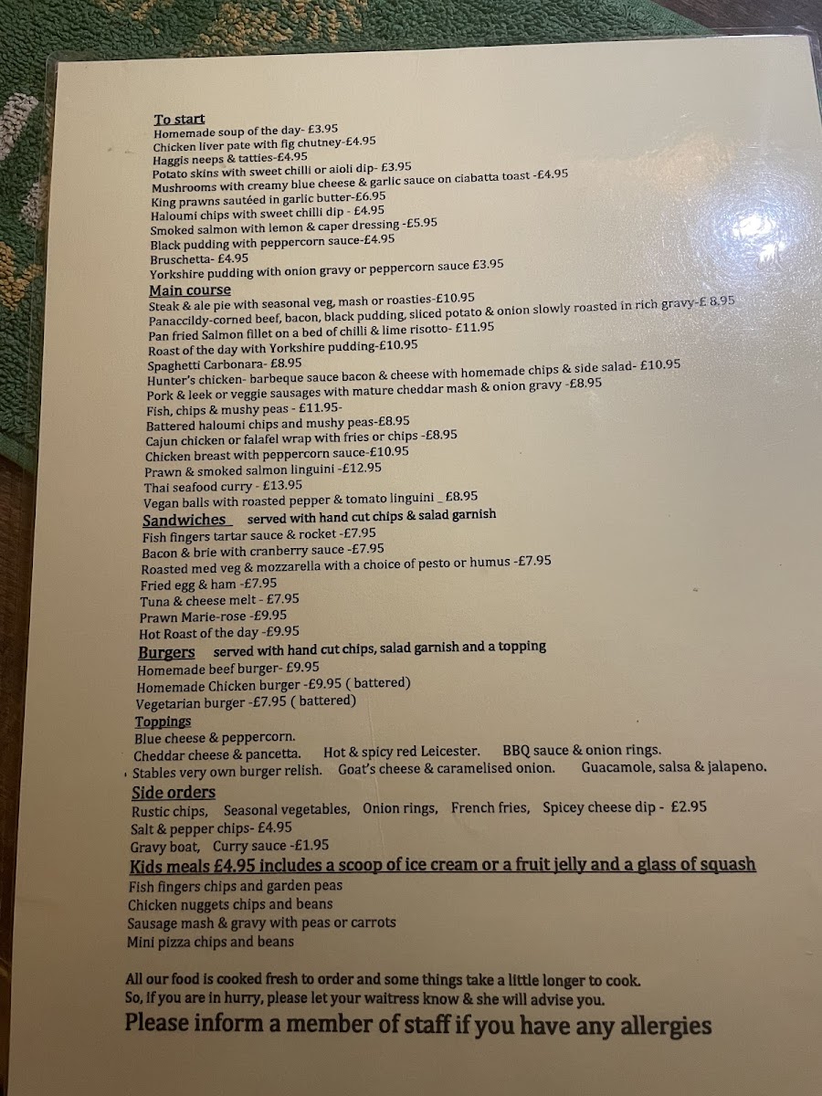 What truly sets The Stables apart is its commitment to homemade, quality food. The pub grub-style menu offers hearty, comforting dishes that stay true to traditional British flavors, executed with care and freshness. Highlights like the classic fish and chips, praised for their impeccable quality, and the robust black pudding stand out. The roasts, especially the turkey and succulent beef, have drawn unanimous acclaim for their tenderness and generous portions of seasonal vegetables, all smothered in rich gravy. Their beef pie and the battered chicken burger with spicy Red Leicester showcase a masterful blend of flavour and comfort, making every bite memorable.
